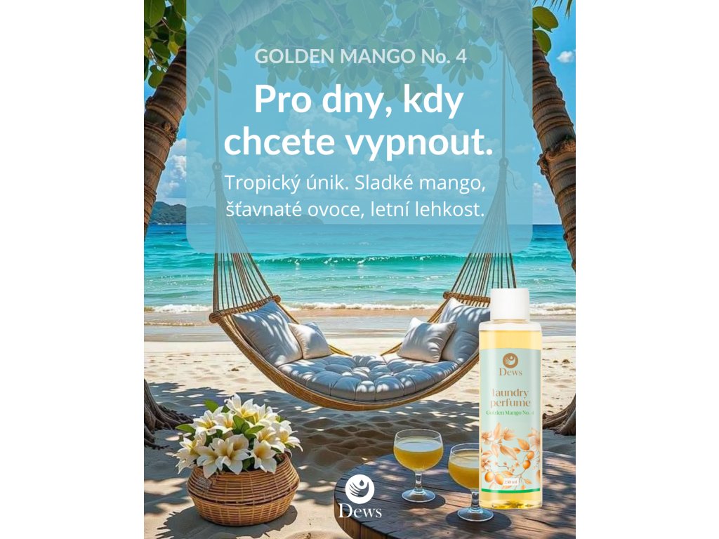 Nechte se unést parfémem No. DEWS 4 GOLDEN MANGO do tropického dne, kde dozrává ovoce pod sluncem a vzduchem se nese radost a bezstarostnost. Tato vůně je plná šťávy, energie a hebkého dozvuku, který se na prádle drží jako letní vzpomínka.