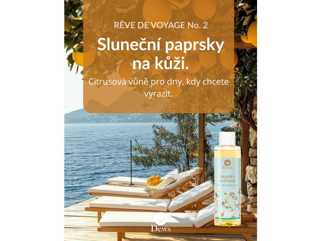 Nechte se unést parfémem Dews No. 2 REVE de Voyage do vaší oblíbené destinace – od prvního citrusového nádechu až po hřejivé dřevité objetí.